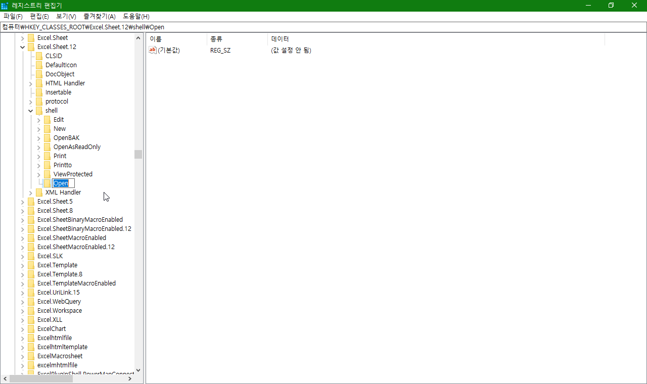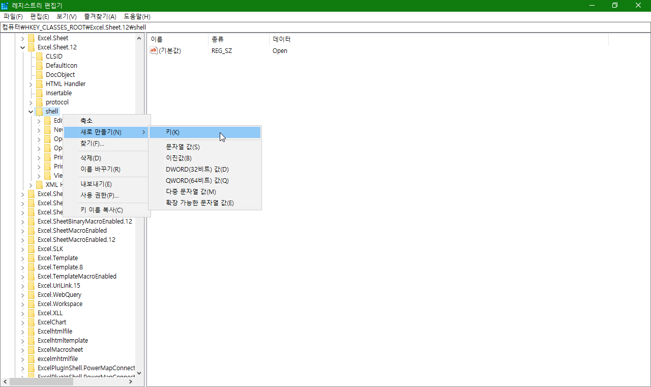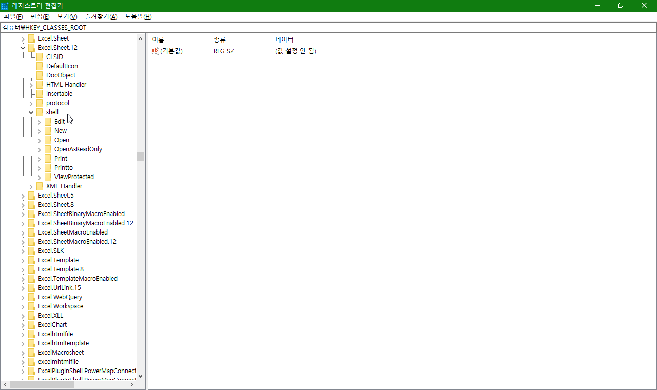 ③ 좌측 폴더중에서 "Excel.Sheet.12" 폴더가 보일때까지 스크롤을 내리고, "shell" 폴더 왼쪽의 ">"를 클릭한다.