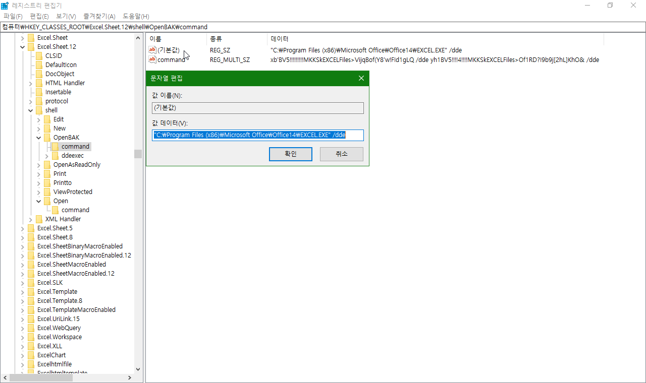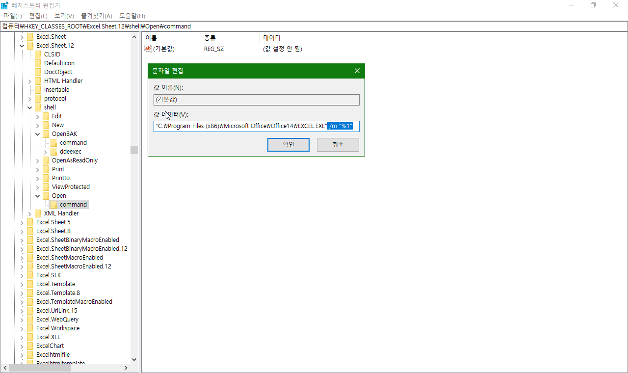 본인 값 : "C:\Program Files (x86)\Microsoft Office\Office14\EXCEL.EXE" /dde