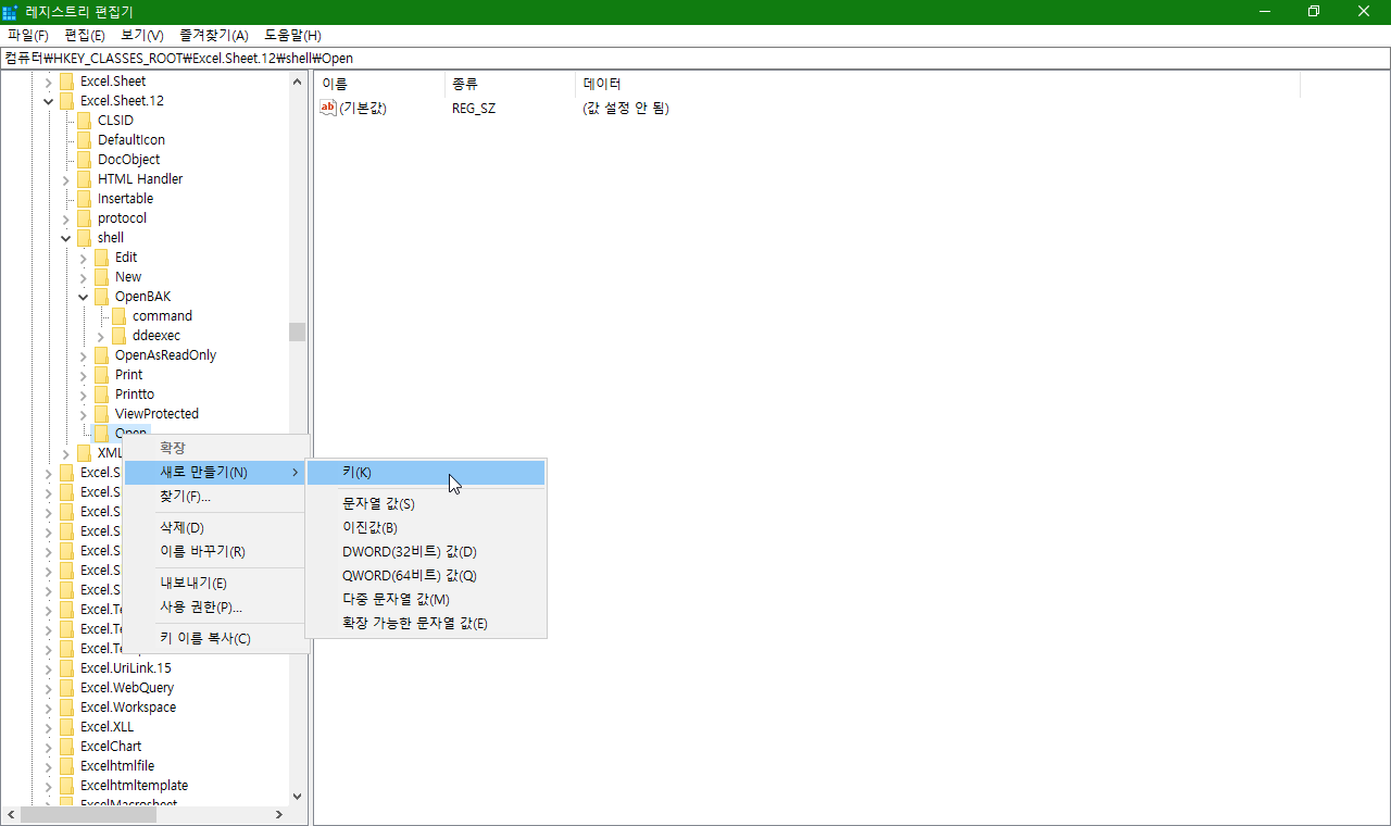 ⑥ ⑤에서 했던 방식으로 이번엔 "Open" 폴더에서 오른쪽 버튼 클릭하여 "새로만들기" > "키" 선택